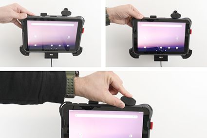 Aan de achterzijde van de houder bevindt zich een swivel (kantel- en draaibare adapter), zodat de houder onder een andere hoek afgesteld kan worden om hinderlijke reflectie op het apparaatscherm tegen te gaan.